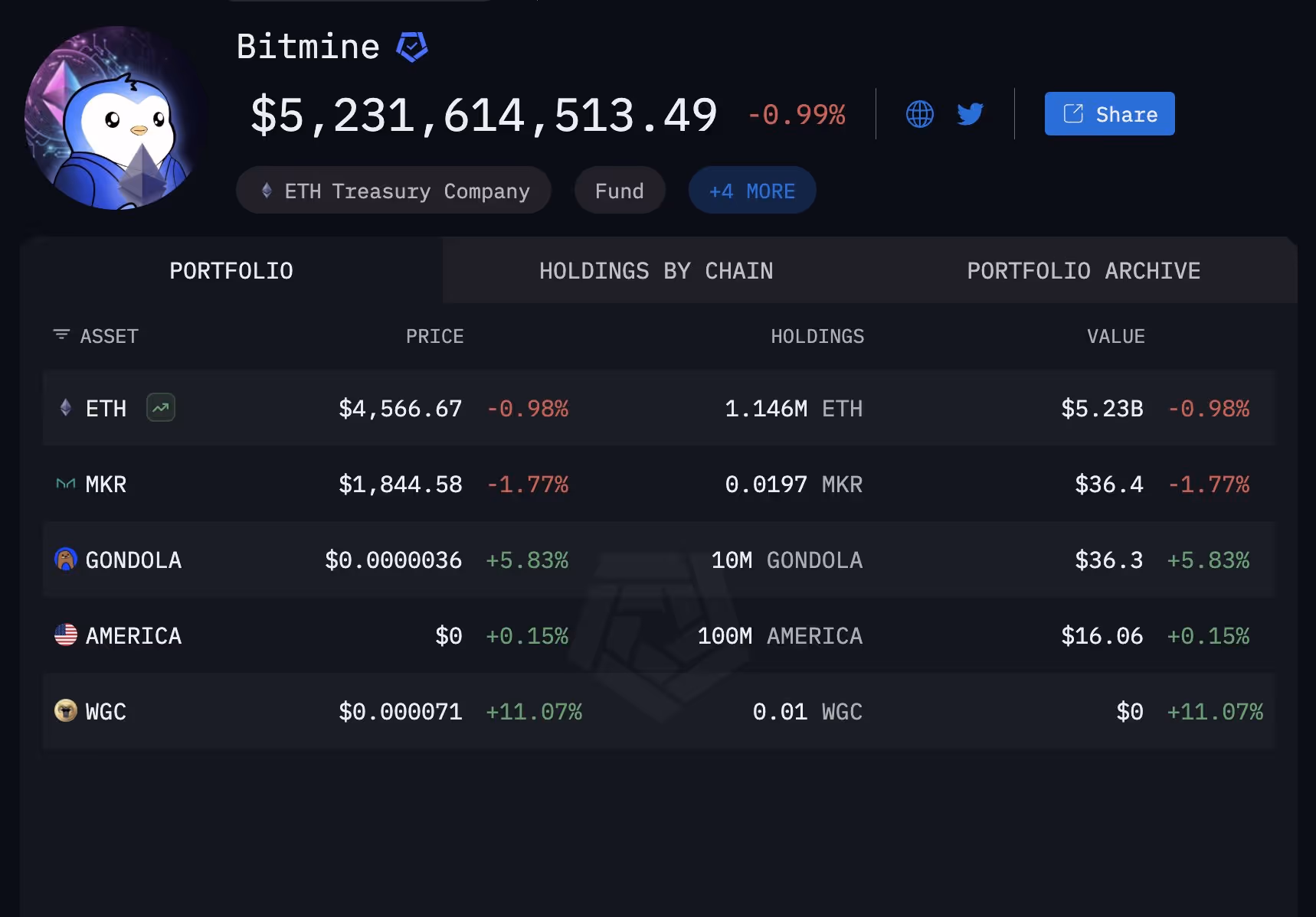 Bitmine Immersion Technologies, chaired by Tom Lee, is now on Arkham. Bitmine holds $5.2 Billion USD of ETH - making them the LARGEST Ethereum treasury company. We are the first to publicly identify Bitmine’s on-chain holdings.