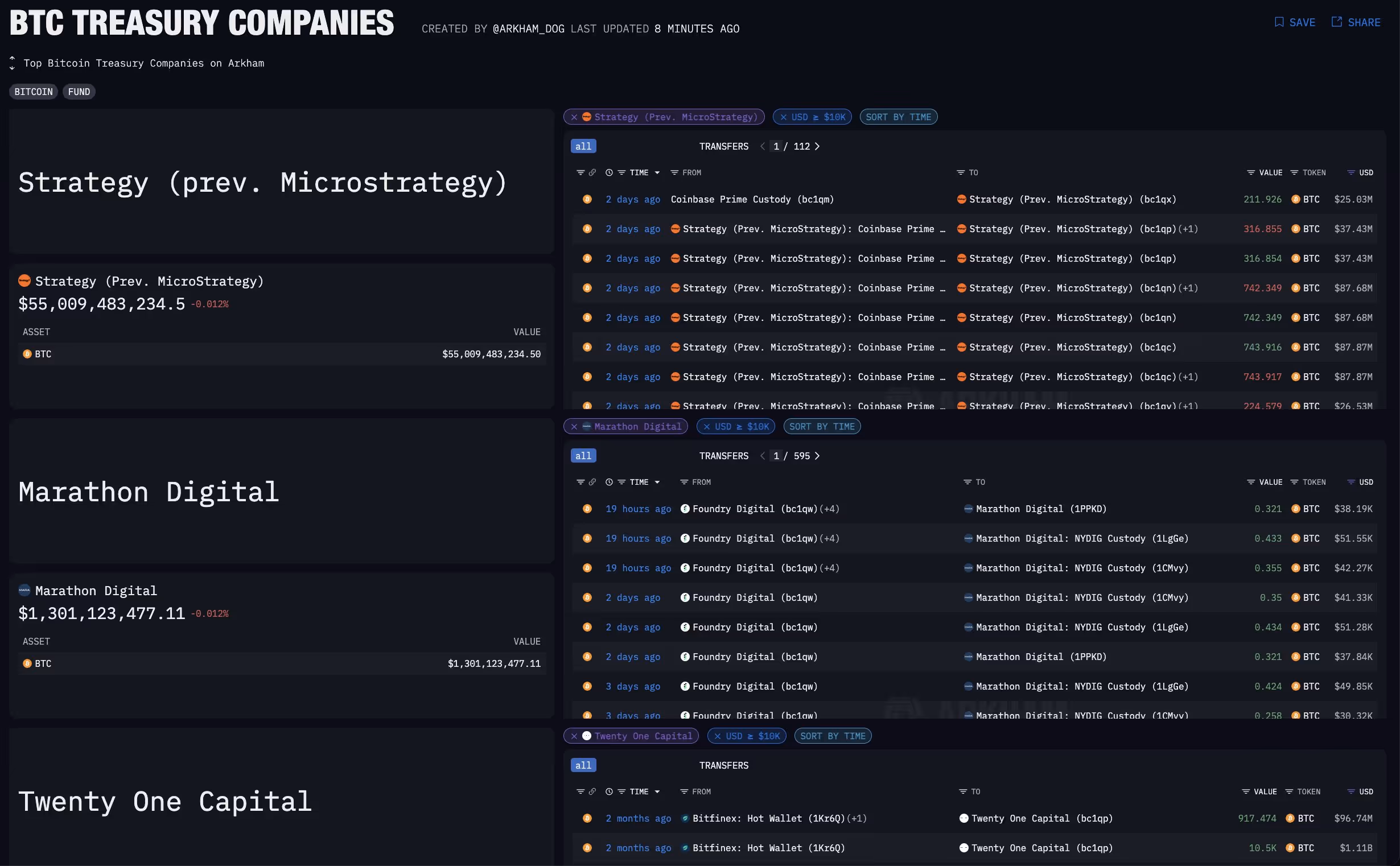 All of the top BTC Treasury companies are now collected into an Arkham Dashboard. Now you can: