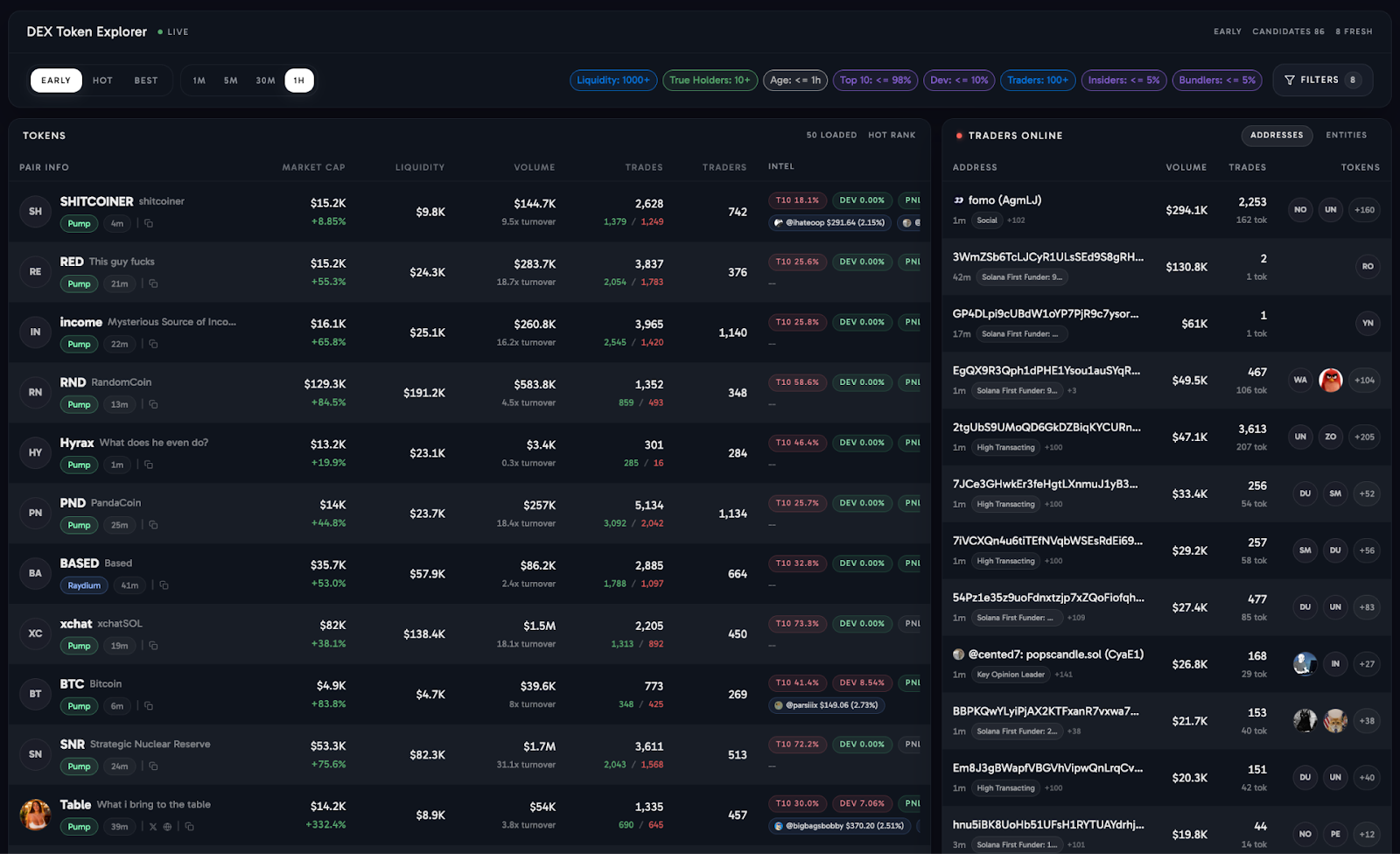 See freshly launched tokens, top holders, highest PnL traders, and any trader’s active and past positions - all in one place. Then trade them.