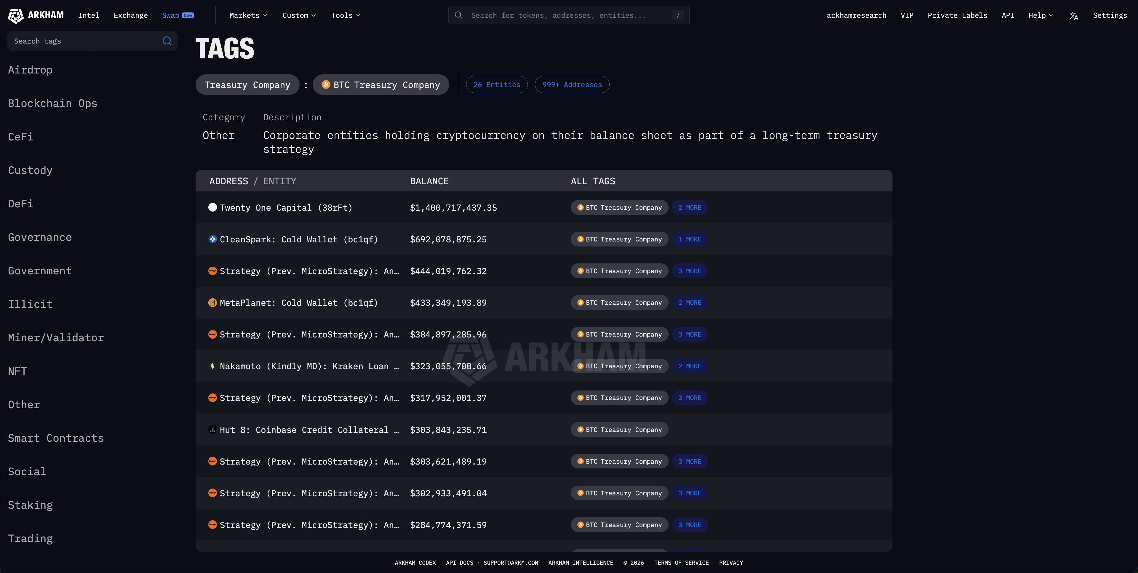 We built a leaderboard to track all of the deanonymized Bitcoin treasury company addresses. It ranks companies like Strategy ($62.4B), MetaPlanet ($3.1B) and Twenty One Capital ($1.5B) by their BTC holdings.