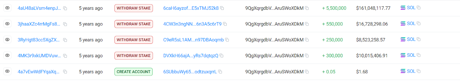 Historical transactions from this stake account also show large transactions of SOL from this account to various Solana addresses. Between August 2024 and November 2024, over 3M SOL tokens were unstaked and transferred, of which over 1.5M SOL tokens remained staked on these new addresses, including 9E8zG, JQ5jC, A6mJn, and 7pgzZ. If these addresses also belong to Yakovenko, this would place the value of his SOL holdings much, much higher at almost $122M at current value.