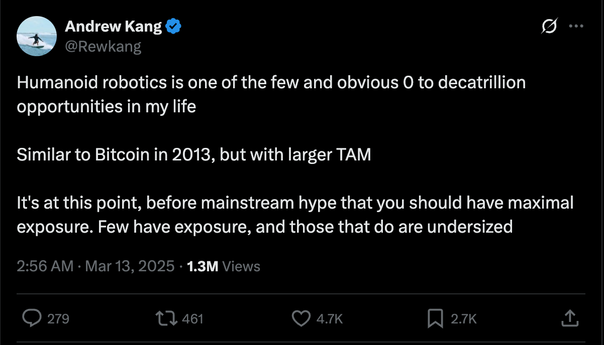 Andrew Kang’s lengthy track record in crypto has made him a prominent member of Crypto Twitter, both as an individual investor and as the founder of Mechanism Capital. From trading Dogecoin on underground Reddit markets in 2013, to exploring the early stages of DeFi in 2019, to trading NFTs with Pleasr in 2021 and even lately making personal investments in memecoins, Kang has a considerable record of his crypto activity. More recently, he has shifted significant attention and capital toward the humanoid robotics sector, signaling the huge growth potential of this sector in the coming years.
