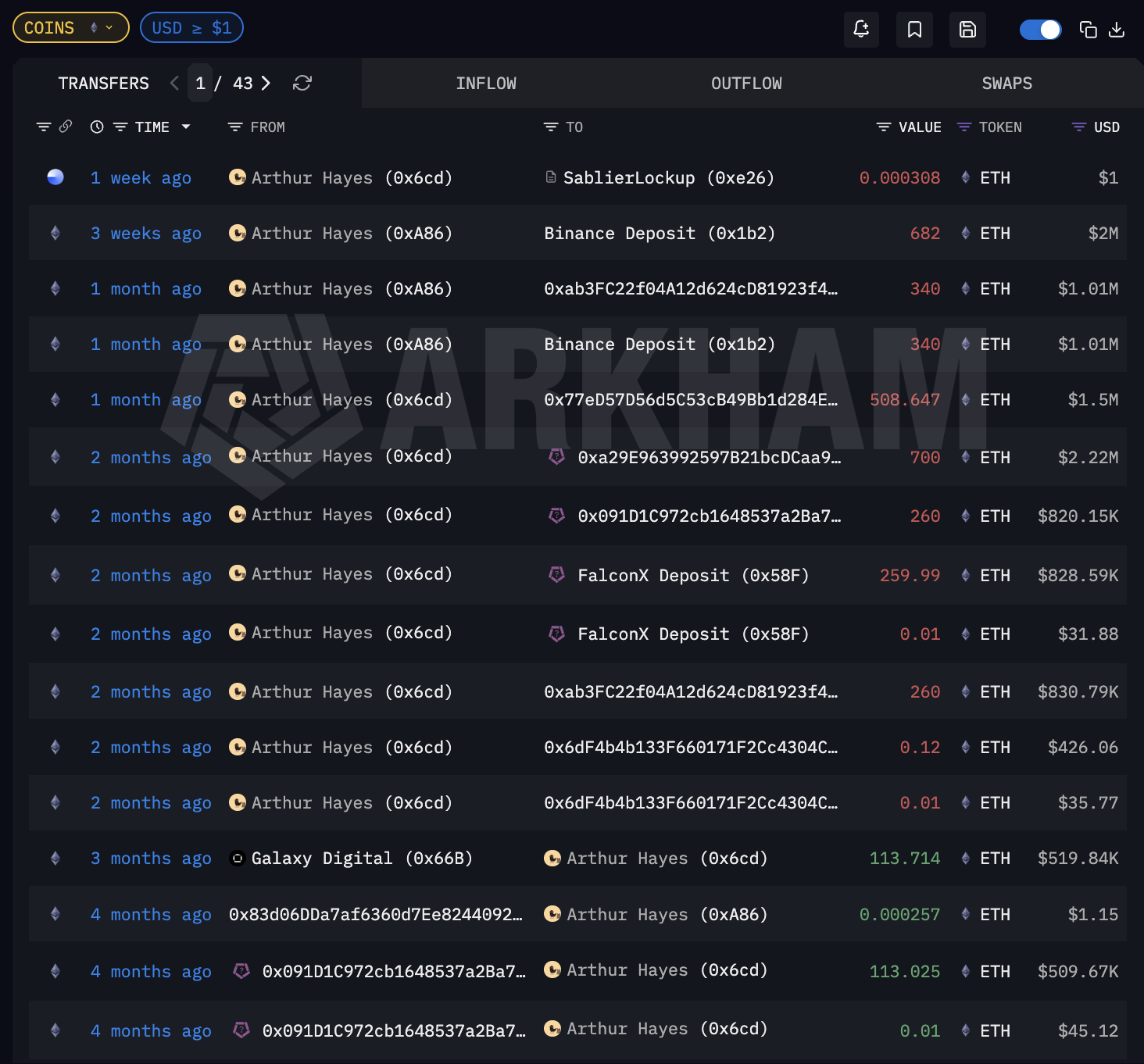 A "crypto whale" refers to an individual or entity holding a disproportionately large amount of a particular cryptocurrency, enough to impact market liquidity or price through their trades. On-chain analytics tools such as Arkham Intelligence identified Arthur Hayes as a major Ethereum (ETH) holder. However, his ETH whale status recently disappeared on the Arkham Intel Platform.