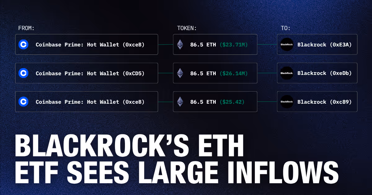 BlackRock’s ETH ETF, ETHA, is seeing large inflows this week, alongside outflows from their BTC ETF, IBIT. In this week alone, BlackRock addresses linked to their ETHA product saw more than $100M in ETH transfers, with almost $50M in the past 24 hours alone.