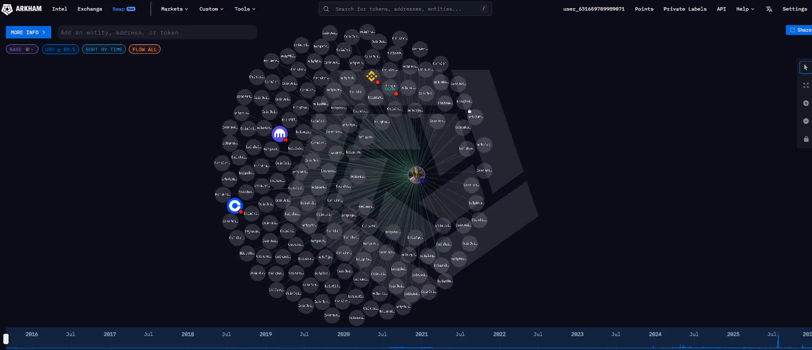 Arkham is a comprehensive blockchain intelligence platform designed to make understanding blockchain activity easier for its users. Arkham offers all of the blockchain intelligence tools that this article has covered within its platform. Arkham allows users to search for wallet addresses or known entities that it has labelled on-chain, and view balances and transaction history of these wallets. The platform also helps users identify where funds originated from and where they’ve gone, letting users follow the flow of funds across the blockchain in an easy-to-understand manner.