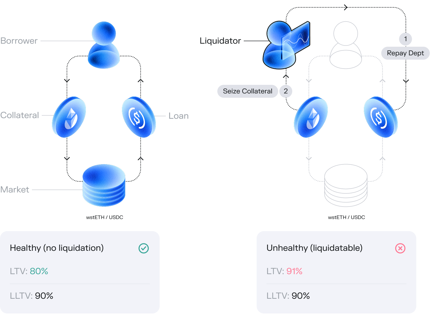 The lender holds the collateral for the duration of the loan and if the borrower repays the principal with interest, they get their crypto back. However, if the collateral value drops below a certain threshold, the position gets liquidated, which gives the lender the right to sell off the collateral to recover the loan value.
