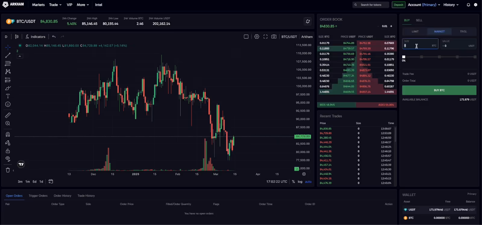 Once your order is placed, you can view its status in the "Open Orders" or "Order History" tab, which is typically located below the price chart. When your order is filled, the assets will be credited to your wallet balance.
