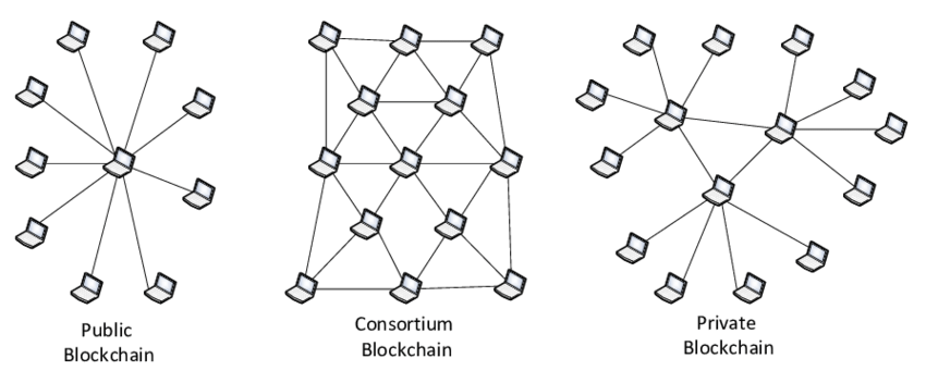 Blockchains can be categorized into three primary types: public, private, and consortium. Public blockchains are permissionless which means that anyone can read the ledger, submit transactions, or participate in validation. Bitcoin and Ethereum are two examples of public blockchains. Private blockchains are controlled by a single organization that restricts participation to approved users and parties. As a result, private blockchains are more suitable for enterprise use cases where confidentiality and security are important. Consortium blockchains are governed collectively by a defined group of organizations instead of a single entity, and sit in between public and private blockchains in terms of openness.