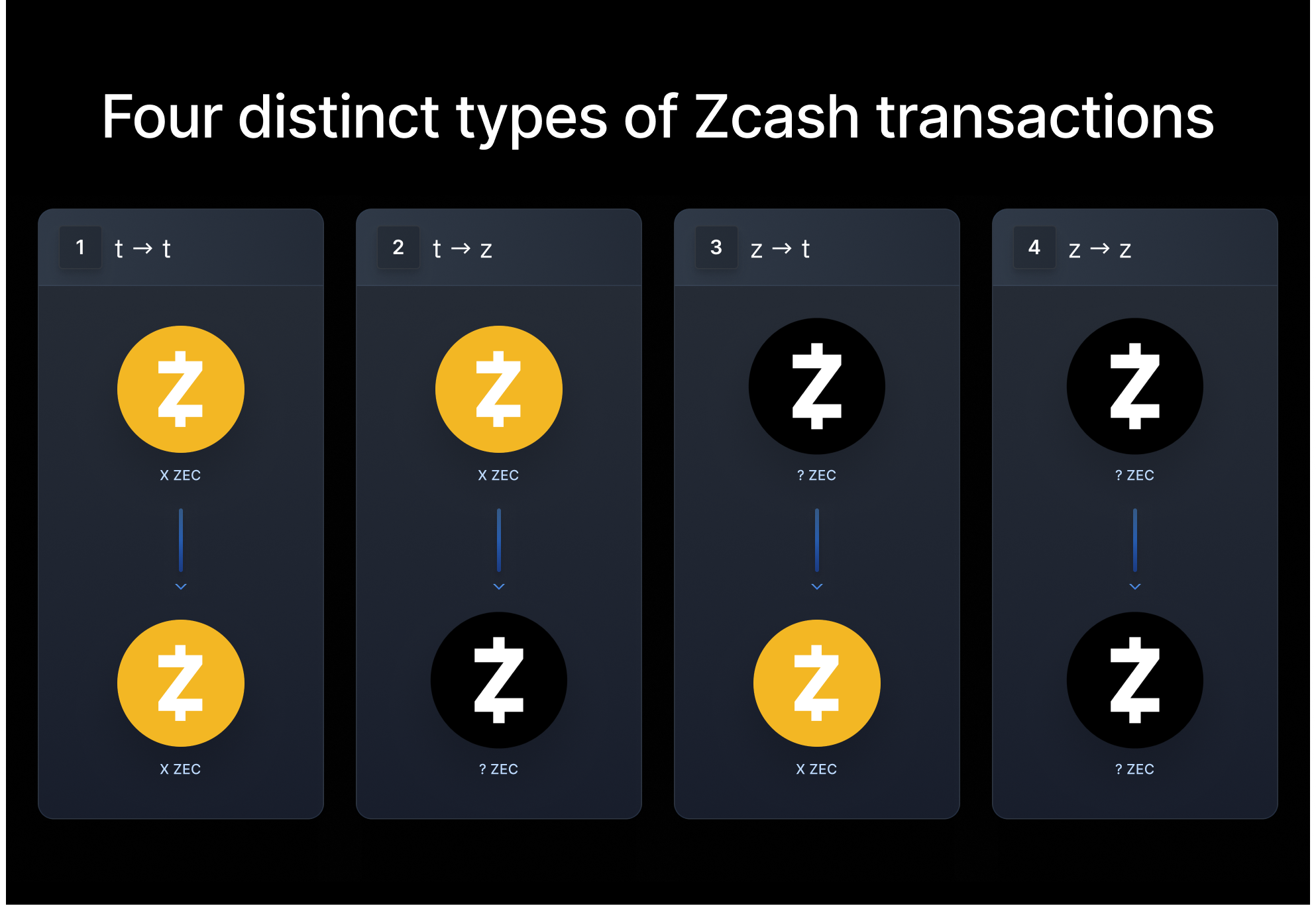 z → z (Shielded to Shielded): Fully private. The only piece of data visible on-chain is the transaction fee. Sender, receiver, and amount are all cryptographically concealed.
