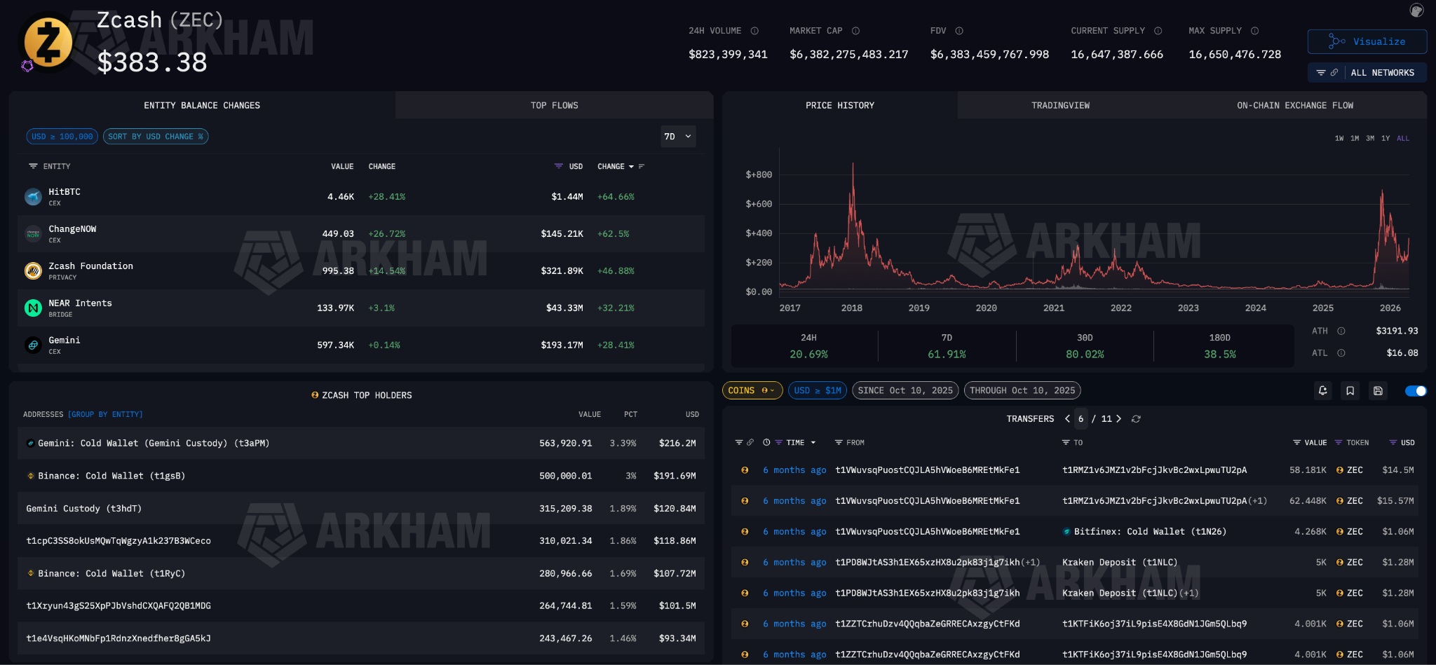 Arkham's data also surfaces individual traders making significant moves. One address acquired $4.49 million worth of Zcash during the market crash on October 10th, then held for five and a half weeks before transferring the coins to Gemini. If the position was liquidated at the time of deposit, the trader netted a $6.6 million profit. They more than doubled their original investment. The full transaction history is visible on Arkham, including the timing of each move and the exchange the coins were ultimately sent to.