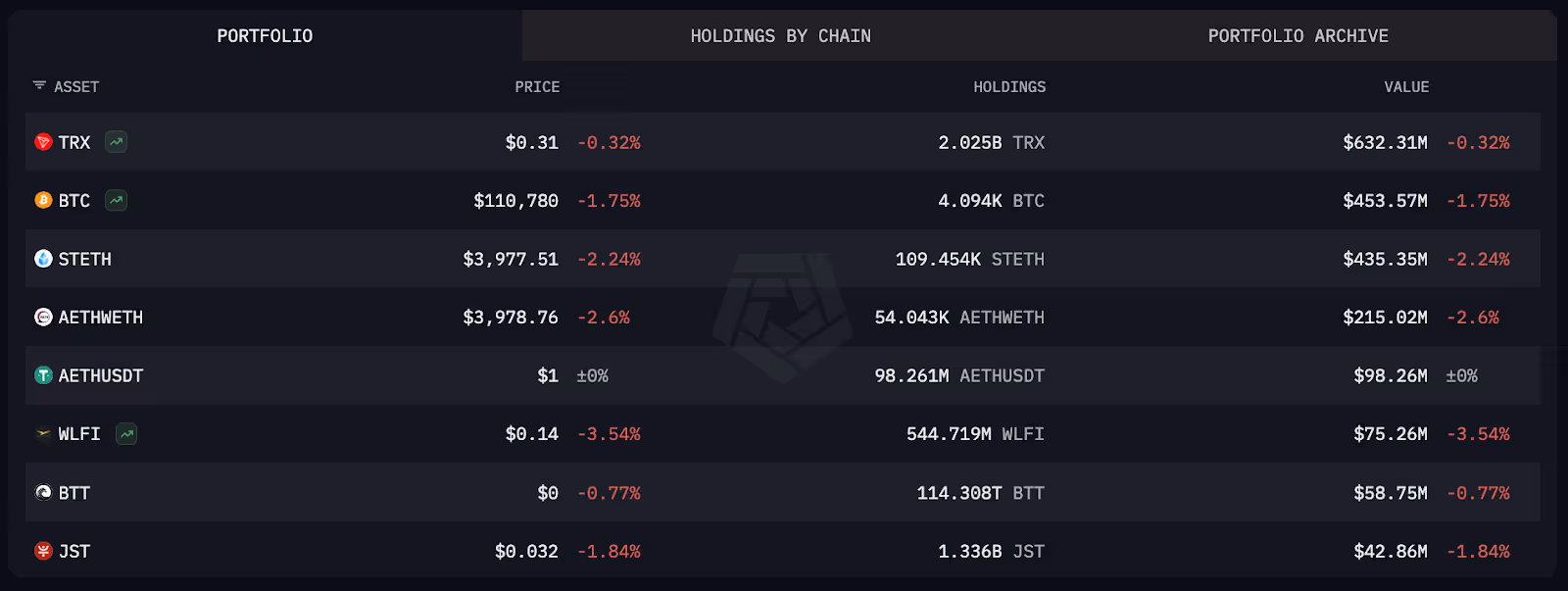 Unlike many crypto executives whose wealth is a matter of speculation, Justin Sun is confirmed to be a billionaire, with a substantial portion of his fortune visible in publicly tracked cryptocurrency wallets. His verifiable on-chain holdings alone are valued at over $2.1 billion at the time of writing, composed of a diverse array of assets including over $600 million in TRX, over $400 million in BTC, as well as various stablecoins, and significant stakes in decentralized finance protocols.