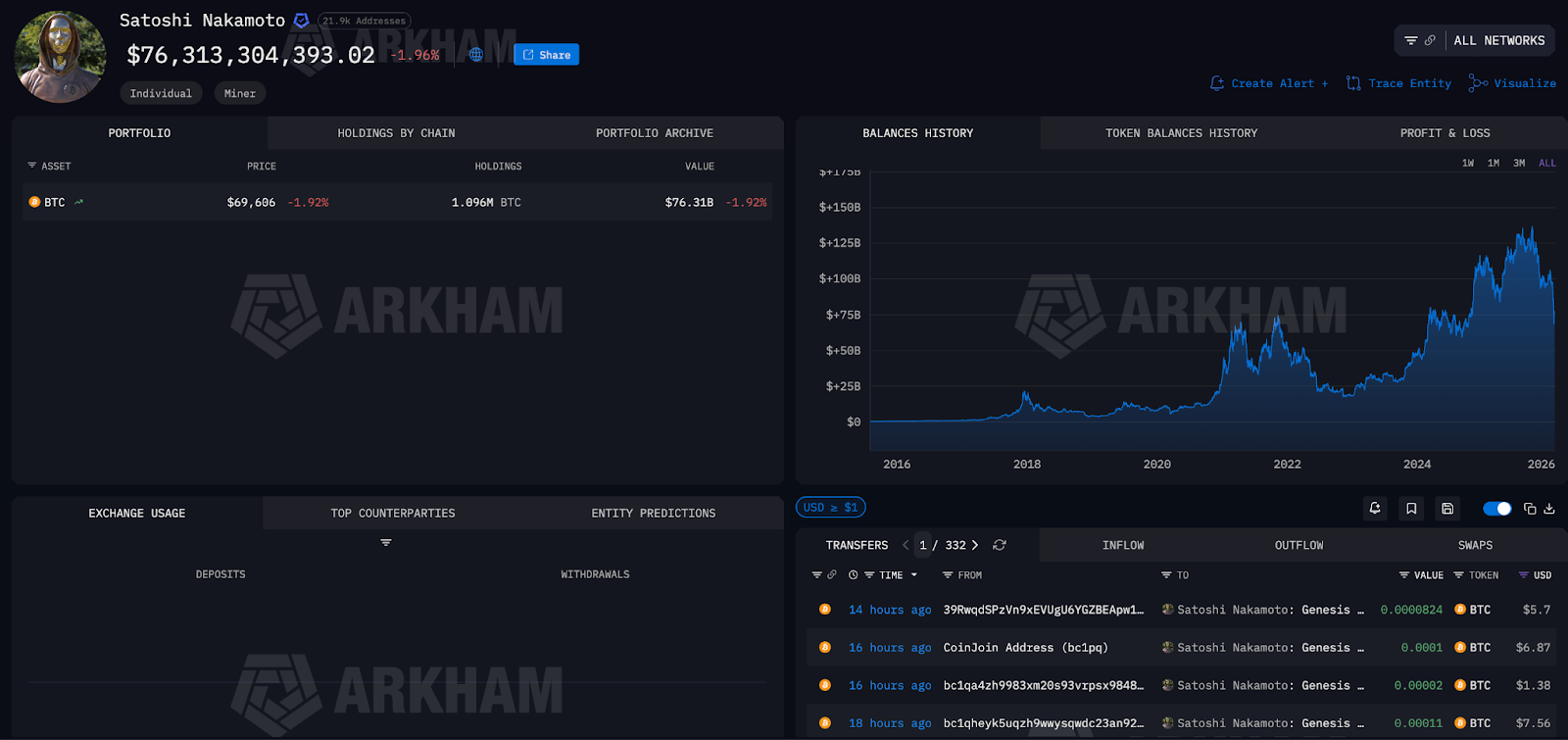 Satoshi Nakamoto is the biggest whale – any activity around his wallets is likely to cause a stir. The Arkham Intel Platform shows that Satoshi holds over 1.1 million BTC, currently valued at $76 billion. At the peak, Satoshi Nakamoto was valued at $135 billion dollars, firmly making the Bitcoin creator one of the richest people in the world.