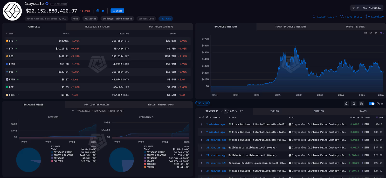 The Arkham Intel Platform also provides powerful tools for monitoring the wallets of ETF issuers. The platform has labelled entity pages for Bitwise, Grayscale, Fidelity, 21Shares and more, allowing users to observe the movement of SOL tokens in real-time. For an explanation on how to make sense of crypto ETFs, read our guide here.