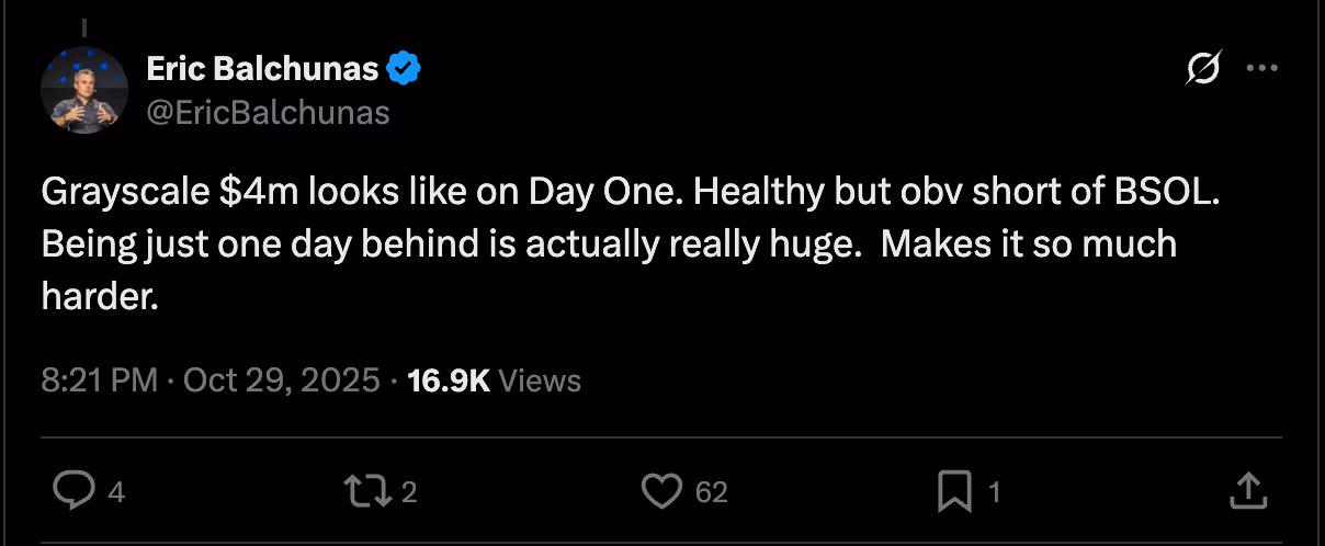Bloomberg ETF analyst Eric Balchunas posted on X stating that BSOL’s first-mover advantage over GSOL ‘makes it so much harder’ for the Grayscale product. BSOL’s management fees are 0.2% whilst GSOL’s are 0.35%.