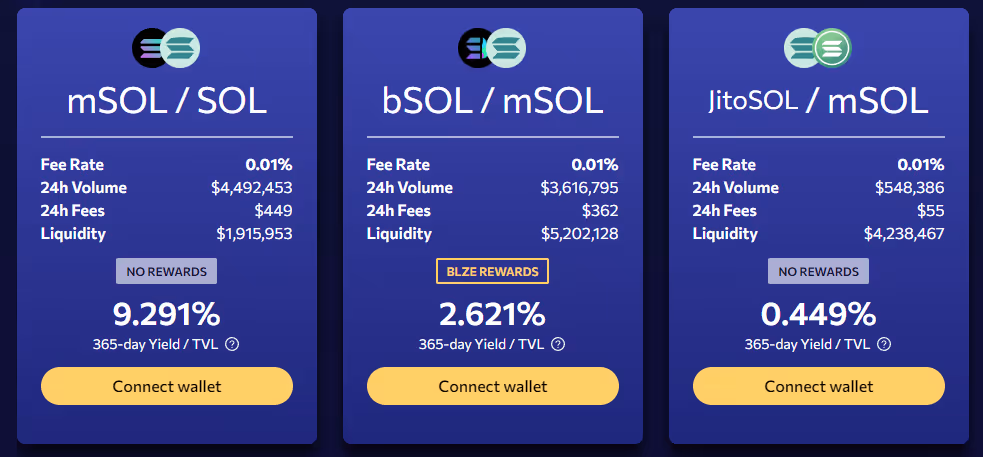 Users can deposit their liquid staking tokens into liquidity pools on DEXs to facilitate swaps between the liquid staking token and other tokens on Solana. In return, users earn fees from swaps made in their liquidity pool as well as any other token incentives provided by the specific protocol. A common strategy for traders seeking to avoid impermanent loss (a common problem for DEX liquidity providers) is providing liquidity against other liquid staking tokens or wrapped SOL itself to reduce fluctuations in value. While yields from this approach are often lower due to the large number of liquidity providers, it is considered by many to be less risky and tends to be favored by those newer to DeFi.