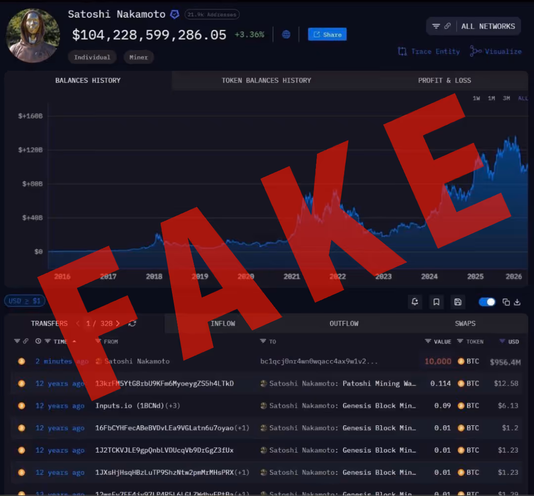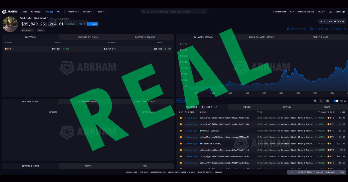 The image in question was a sophisticated doctored fake. By altering the "Transfers" list to include a fictitious transaction of 10,000 BTC to an unknown address, the creator of the hoax tried to mimic real-time Arkham data. Arkham users would easily have seen that the real on-chain data shows that Satoshi’s 1.1 million BTC remain exactly where they have been for a decade.