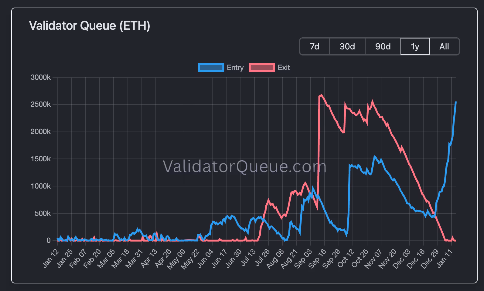 A declining validator exit queue and a swelling entry queue is a sign that ETH holders are locking capital in for a longer period of time. The price of ETH is up over 10% so far this year.