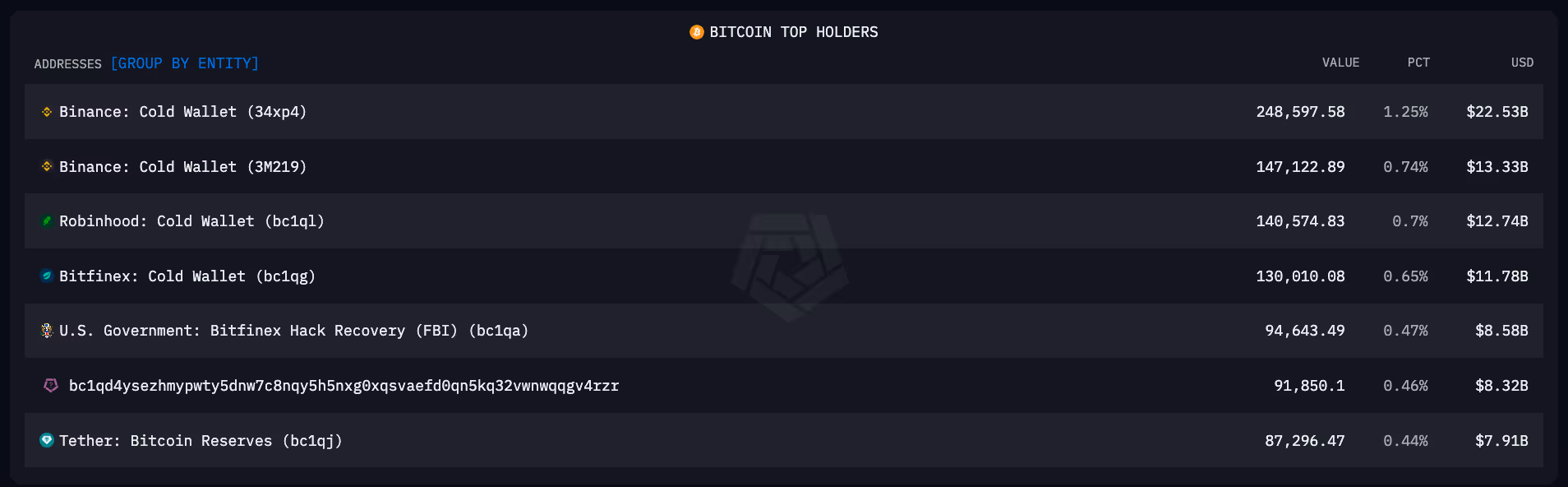 The fifth largest wallet is controlled by the U.S. Government from the Bitfinex Hack Recovery. The sixth largest is a wallet controlled by Tether to manage their Bitcoin reserves.