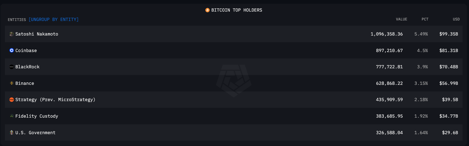 When grouping different wallets together into an entity, Satoshi Nakamoto - the pseudonymous creator of Bitcoin - is the largest holder of the currency, in possession of 1.096 million BTC (around $100 billion). Arkham’s tags are derived from a known mining pattern referred to as the Patoshi Pattern, and include the only (known) addresses from which Satoshi spent BTC from. Arkham’s research indicates he acquired this amount as a reward for mining 22,000 blocks.