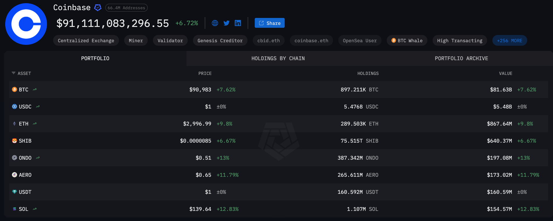 Coinbase takes the top spot for exchange BTC holders, with 897k BTC worth $81.6 billion USD identified on-chain (on behalf of themselves & customers custodying with Coinbase). Coinbase is also known to invest a portion of its net income in crypto assets and also holds a certain amount for operating purposes i.e. to meet customer withdrawals at any given time.
