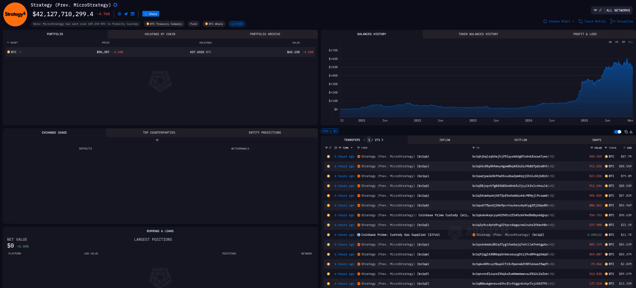 Strategy (formerly MicroStrategy) transferred 43,415 BTC worth $4.26B to over 100 different addresses today.