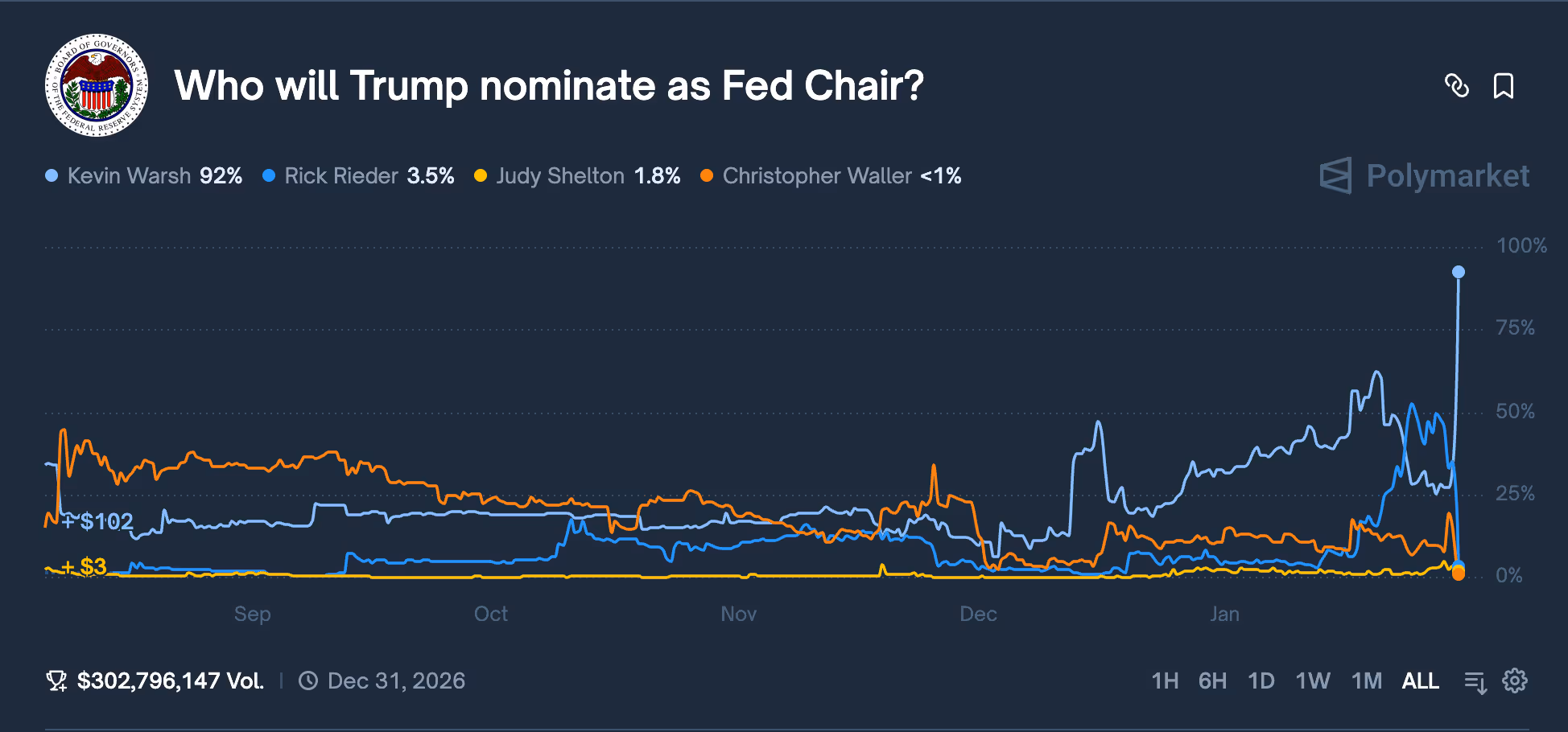 A former member of the Federal Reserve Board of Governors, Warsh is known for being more of a "hawk" than the other candidates. He has often emphasized the importance of maintaining the Fed's independence and prioritizing long-term monetary stability and inflation control. Such an approach could lead to slower rate cuts, reducing overall volatility and potential upside in the markets. However, this could lead to a healthier, more sustainable rally for the long run. On the crypto front, Warsh has been a vocal proponent of a US Central Bank Digital Currency (CBDC), although he has expressed skepticism about decentralized cryptocurrencies. As of 30th January, Polymarket puts Warsh's chances of becoming the next Fed Chair at 93%.