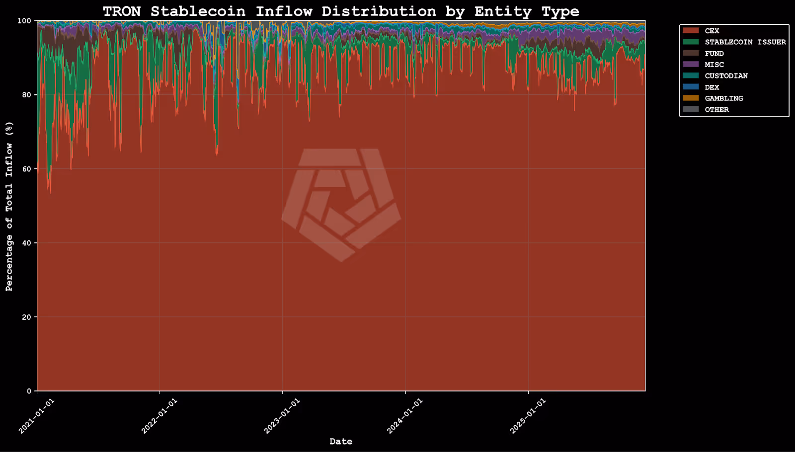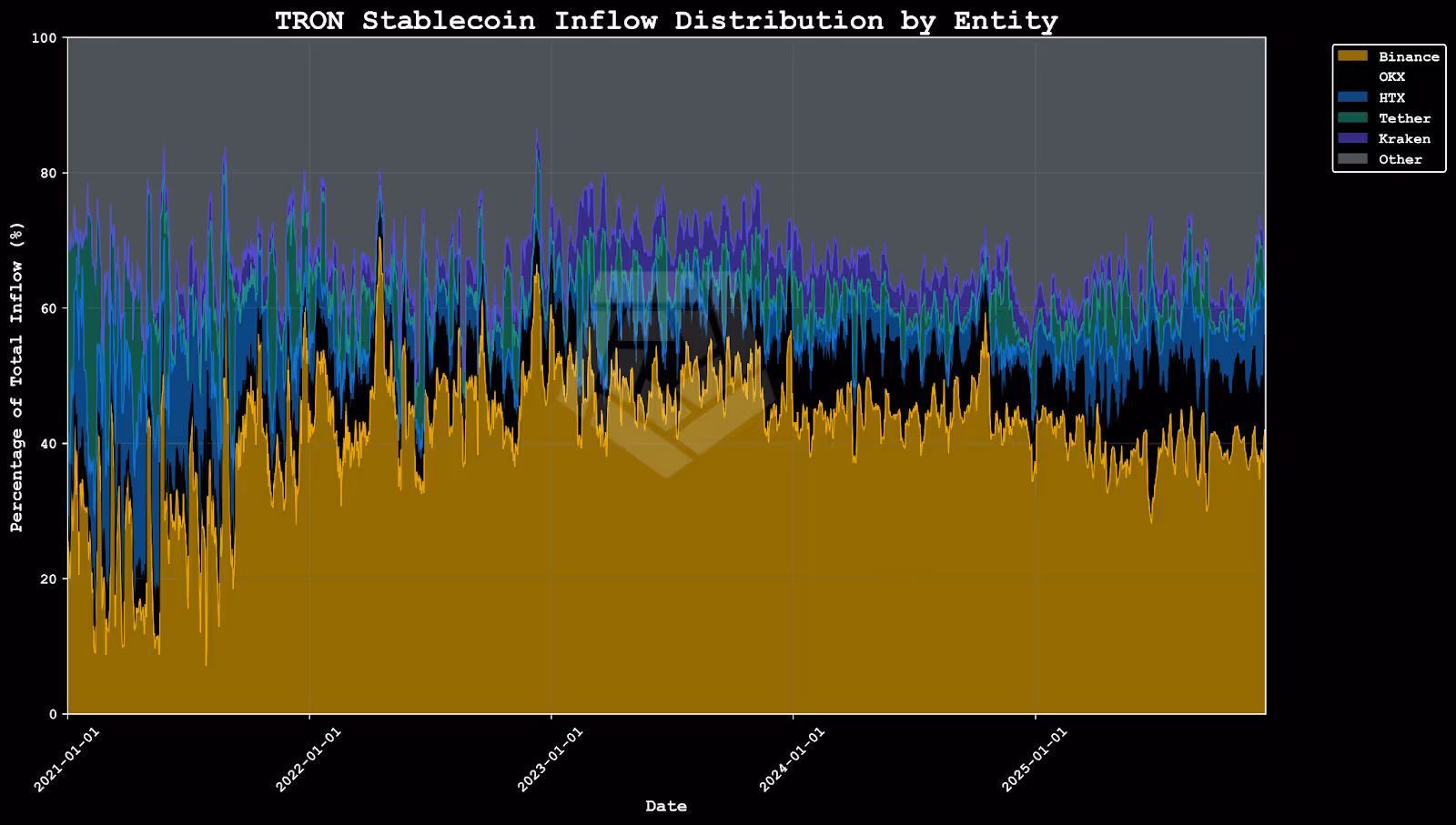 The flow patterns on TRON reveal a network dominated by exchange activity. Centralized exchanges account for the vast majority of inflows, with Binance alone capturing 30-50% of all labeled flows throughout the period.