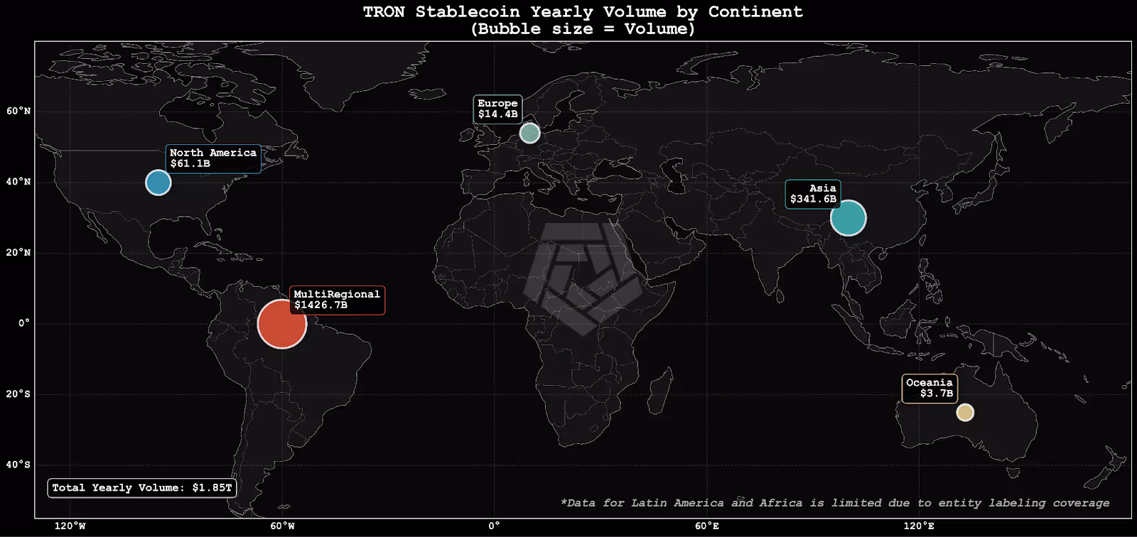 Geographically, activity is weighted toward Asia, accounting for nearly $341 billion annually. Emerging markets including Turkey, Indonesia, and India contribute significant volume, reflecting TRON's appeal where transaction costs drive demand for efficient infrastructure.