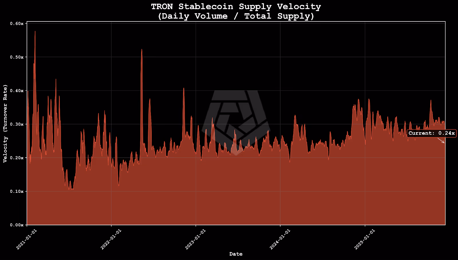 On-chain data suggests TRON’s stablecoin usage emphasizes settlement and transfer activity, while its broader DeFi ecosystem continues to evolve. Centralized exchanges account for a majority of labeled stablecoin inflows. This exchange-centric pattern, combined with daily supply velocity of 0.2-0.3x, indicates users treat TRON-based stablecoins as a utility for moving value between platforms and jurisdictions. The velocity remains consistent regardless of market conditions, suggesting TRON's core use case is insulated from speculative cycles.