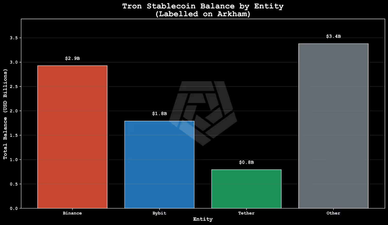 Stablecoin distribution skews toward mid-sized holders, suggesting a more retail-oriented user base compared to Ethereum's institutional concentration. Among labeled entities, Binance holds the largest balance at $2.9 billion, followed by Bybit at $1.8 billion.